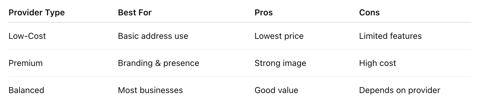 When comparing virtual office providers, focus on these practical areas: